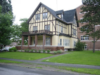 | Foto de la fachada de una bonita casa rústica estilo inglés antiguo de dos pisos con mucha vegetación y algunas enredaderas en las columnas |